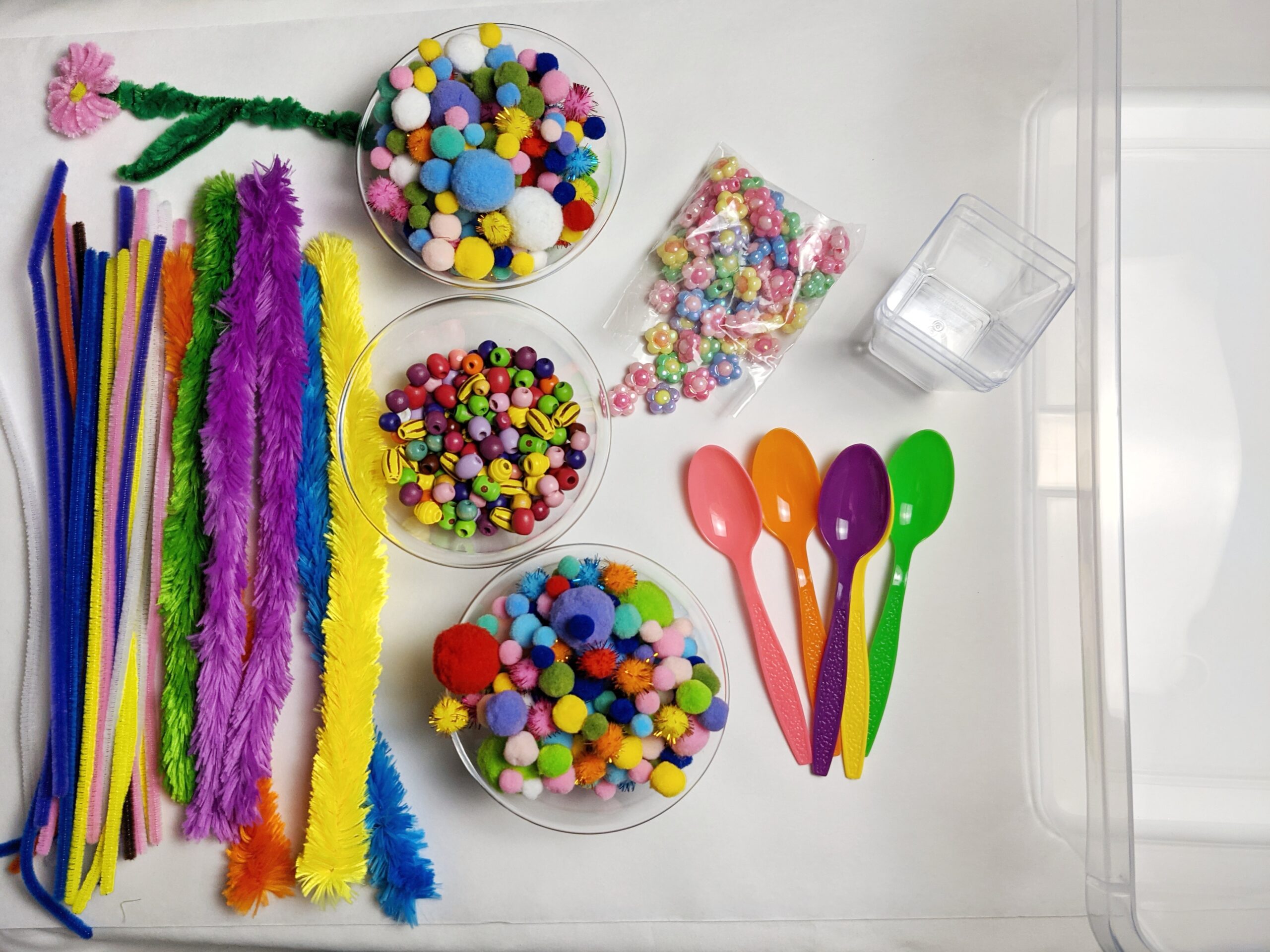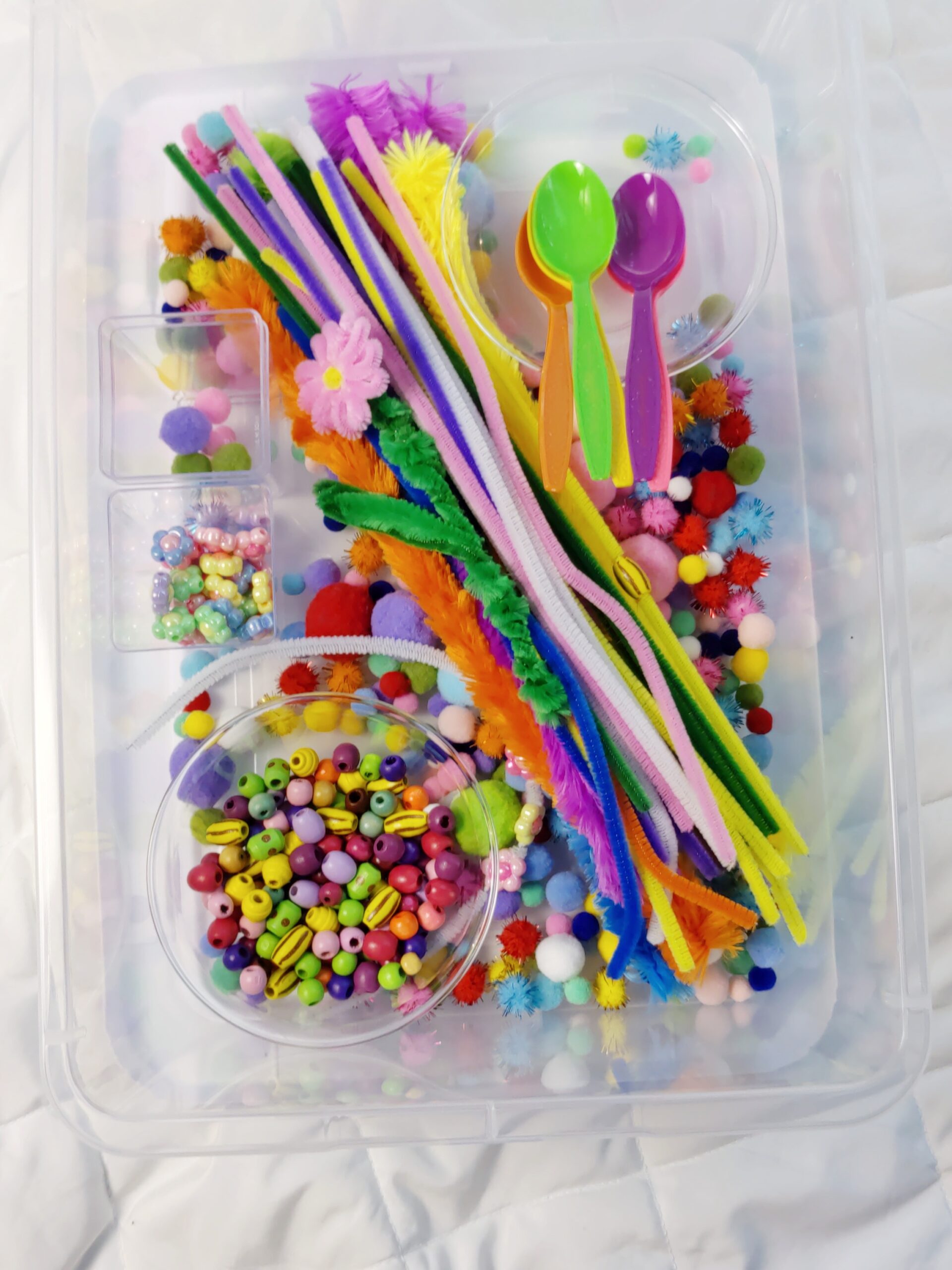 This one was just that! I just added a little bit of everything I had and it turned out so cool. The two year old I care for has already spent so much time exploring this bin. Her favorite thing has been just pouring the beads back and forth into the little containers. She also strung some beads on the pipe cleaners and made bracelets. I even found her siblings entertained by it in moments of play and they came up with some really cool color-sorting ideas.