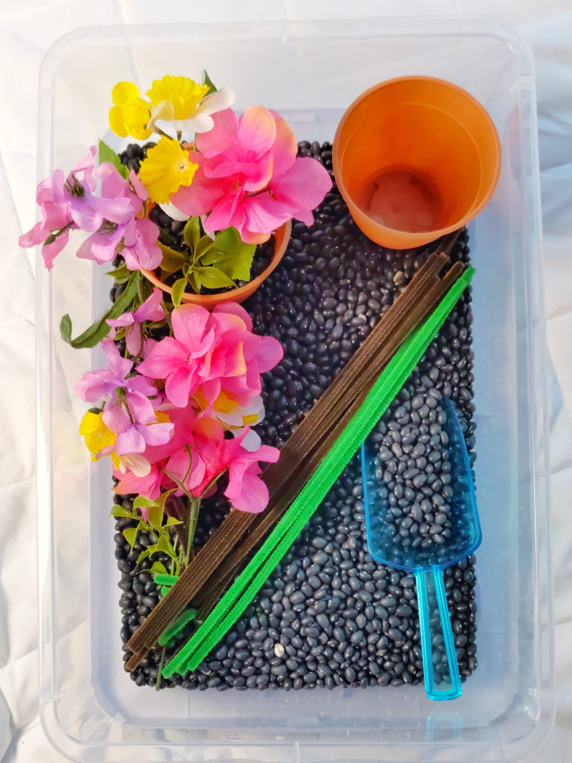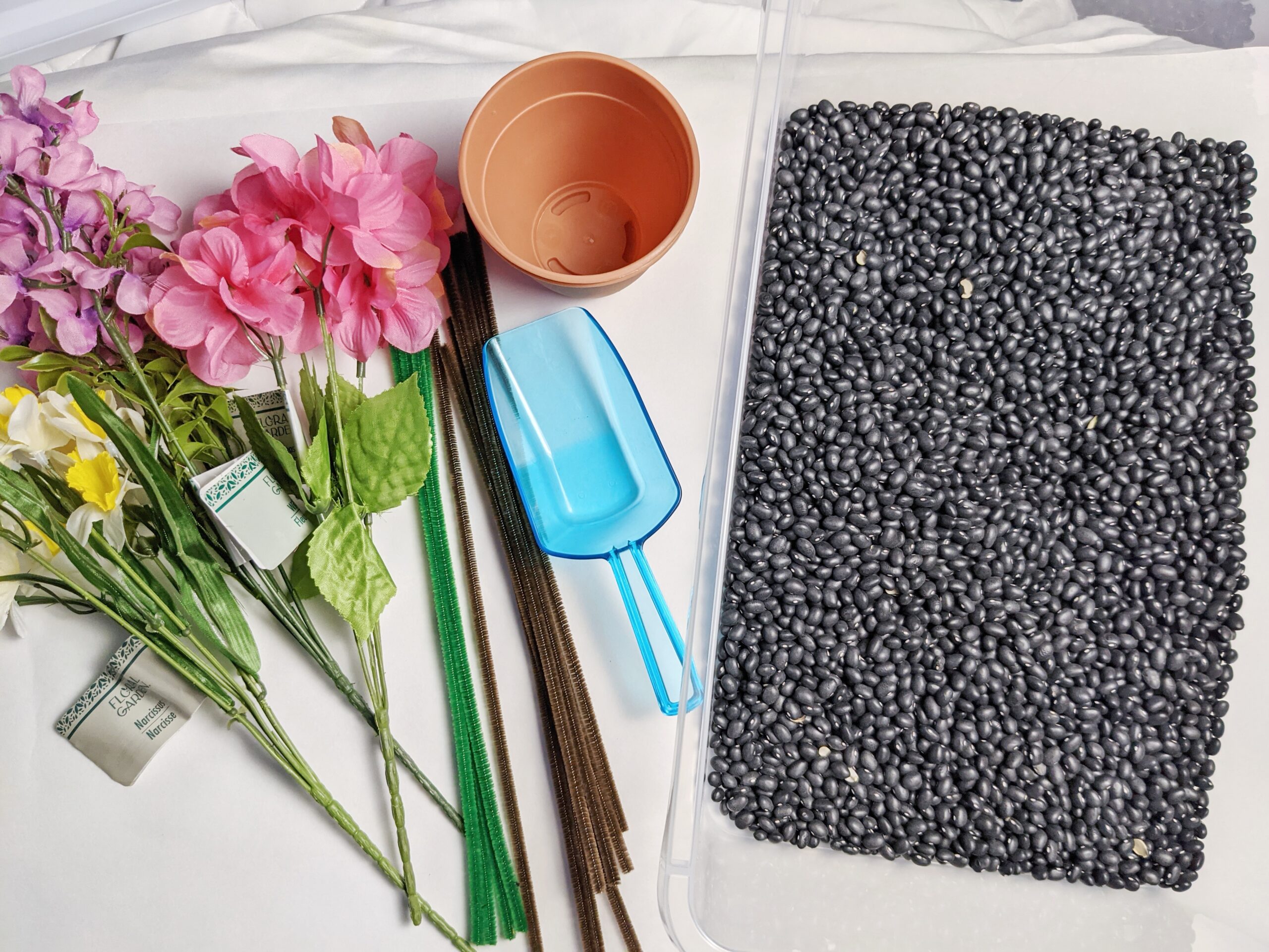 Starting with black beans I had on hand, I added these plastic terracotta planters (found at the dollar store) to the bin. I had also grabbed a few different colors of silk flowers that I cut into smaller sections. With the addition of scoops, this bin was done! It was that simple!
