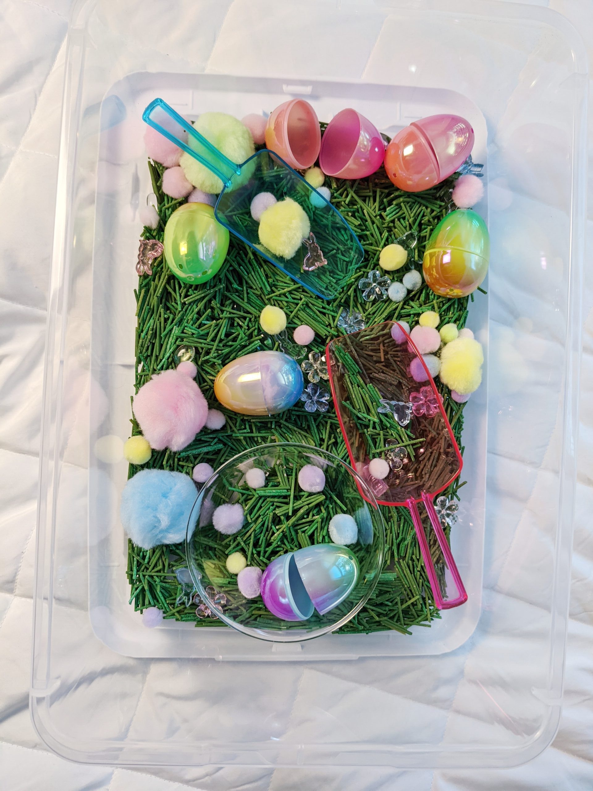 I added some pastel pom poms, plastic eggs, clear bowls, and scoops. The cool find was these little acrylic filler gems that I found at Hobby Lobby. I really loved these and the pop of sparkle they add to the bin!