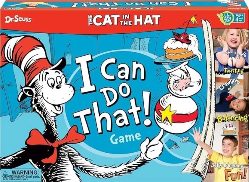 We found this fun game, perfect for young children called “I Can Do That” that gives them fun activities to do like balancing, hopping, twirling, and so much more. It was a hit for her and my little brothers! Too bad it is hard to find now but you can still make up some fun activity ideas based off the Cat in the Hat books.